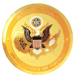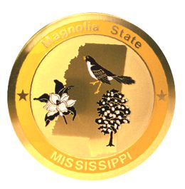 Domed disks (2"), gold-finish emblems (flat, without ring top - 1-3/8") and gold-finish lapel pins (7/8" with military clutch back). Disks and emblems can applied to a variety of mementos. Each disk is photo-etched and includes state silhouette, state motto, state flower, state tree, and state bird, all enamel-filled in natural colors.